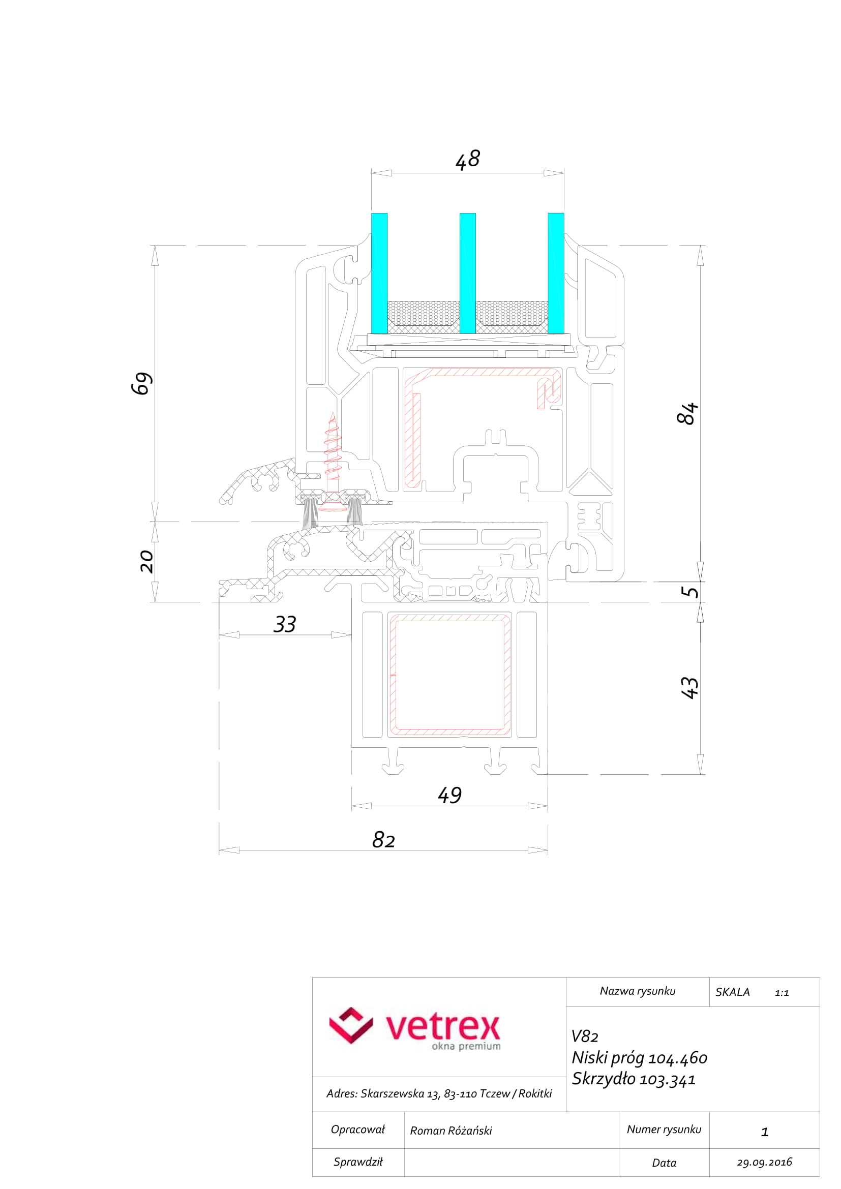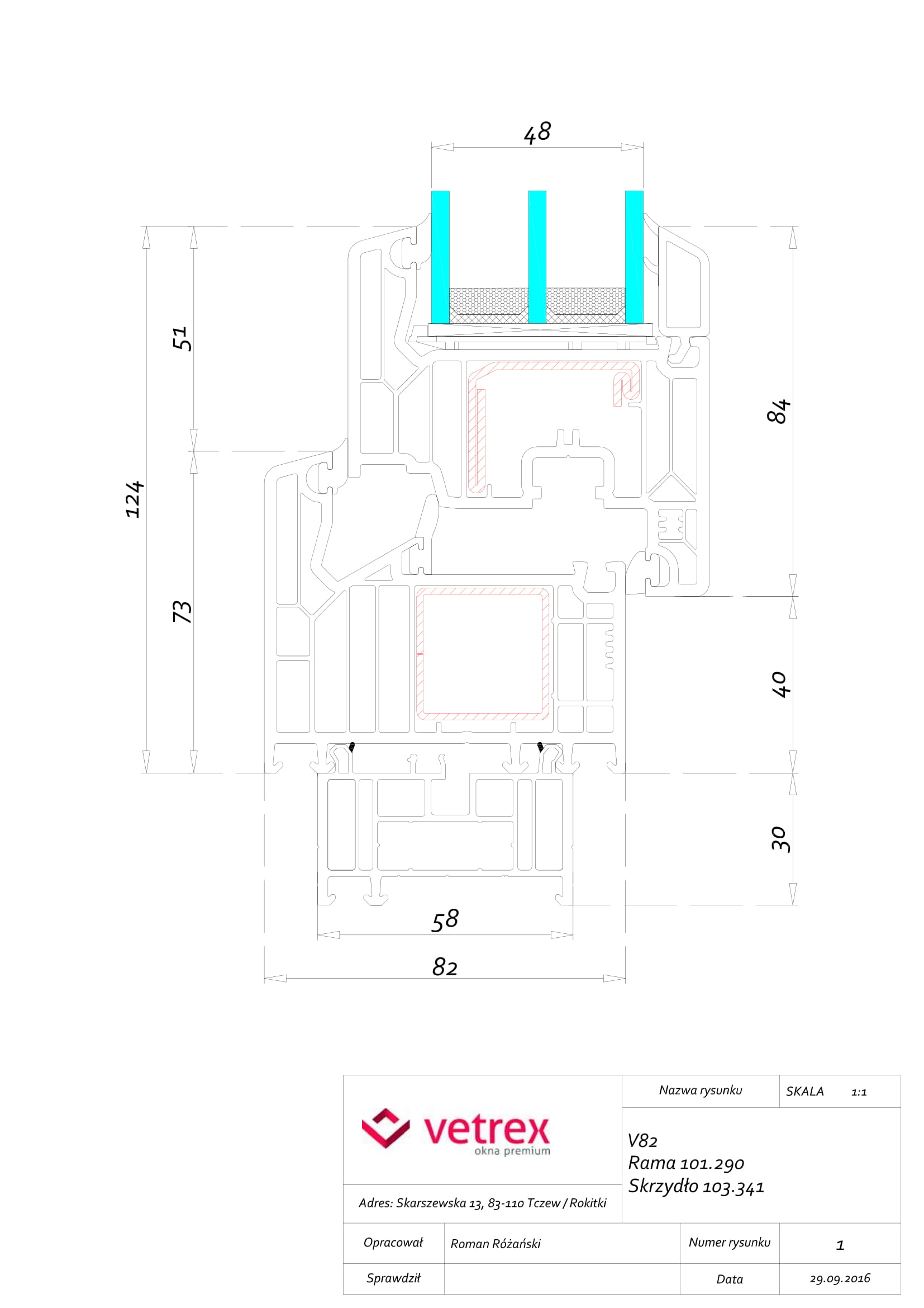 Od strony technicznej system V82 to profil Veki z 7 komorową ramą i 6 komorowym skrzydłem o szerokości 82mm, całość wyłącznie w klasie A; potrójny układ uszczelek z listkową uszczelką środkową; wielokrotnie gięte wzmocnienia ze stali ocynkowanej w skrzydłach i ramach o niespotykanej dotąd na rynku wytrzymałości; zgrzew VPerfect; pakiet 3 szybowy (Ug=0,5); okucia niemieckiego lidera firmy Roto; system krytych lub widocznych zawiasów; ciepłe ramki międzyszybowe Master Therm,; klamki Swing Secustik z blokadą błędnego położenia klamki i podnośnikiem skrzydła w skrzydłach RU; dwa zaczepy antywyważeniowe w każdym skrzydle; mechanizm 4 stopniowego uchyłu lub rozwarcia w skrzydłach RU oraz dodatkowo – bez dopłat, listwy podparapetowe z uszczelkami, które zapewniają optymalne połączenie okien z parapetami oraz zwiększają izolacyjność termiczną i akustyczną. 7 kolorów w standardzie oraz duży wybór kolorów specjalnych.
